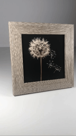 Single Dandelion 6"x6" print embellished with crystals and framed as pictured, overall size is 8"x8". Items are made to order and may take 4-6 weeks for delivery.